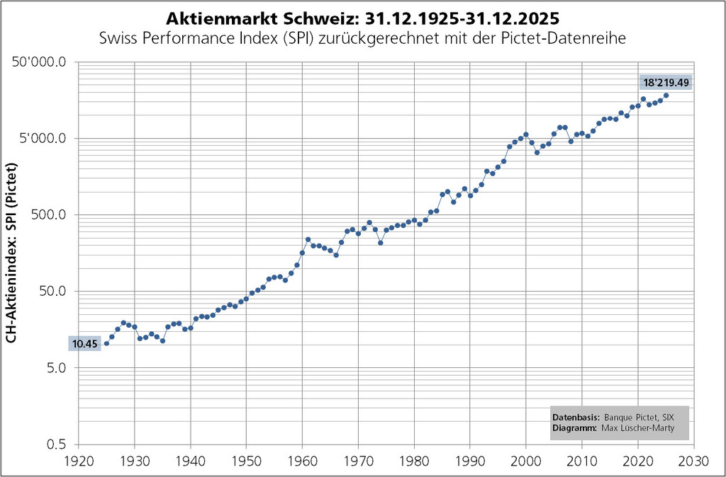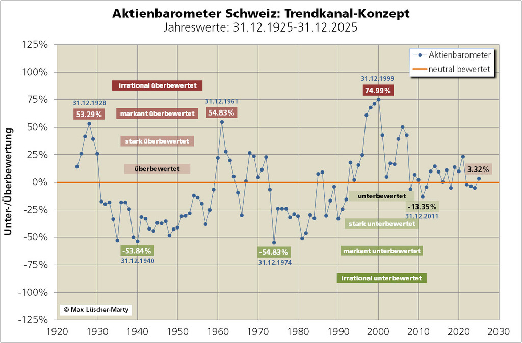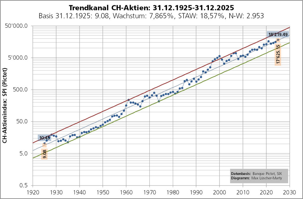 Für den CH-Aktienmarkt und mithin für den zurück gerechneten SPI lässt sich für die letzten 100 Jahre ein nahezu idealtypischer Trendkanal ausmachen. Mit 18'219.49 Punkten per 31.12.2025 notiert der SPI 3,37% über dem «trendneutralen» Wert (Kanalmitte) von 17'625.15 Punkten. Man kann von einer moderaten Überbewertung sprechen.