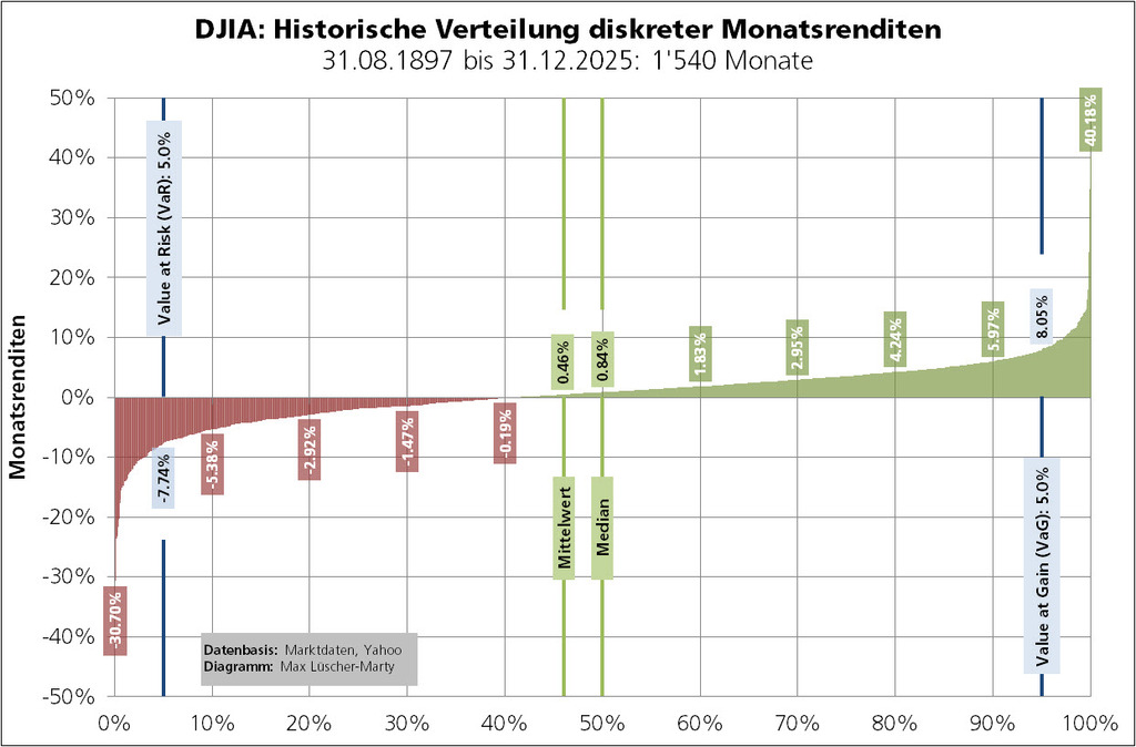 Das Spektrum von maximalen Monatsverlusten bis hin zu maximalen Monatsgewinnen ist ausgesprochen breit. Den grössten Monatsverlust (–30,70%!) registrierte der Dow Jones Industrial im September 1931, den höchsten Monatsgewinn (+40,18%!) im April 1933. Die historische Wahrscheinlichkeit eines Monatsverlusts von mehr als ca. (–)7,74% beträgt 5%. Ebenso 5% ist die historische Wahrscheinlichkeit eines Monatsgewinns von mehr als ca. (+)8,05%. Im statistischen Mittel endet jeder zwanzigste Monat mit einem Verlust von mehr als (–)7,74% bzw. einem Gewinn von mehr als (+)8,05%.