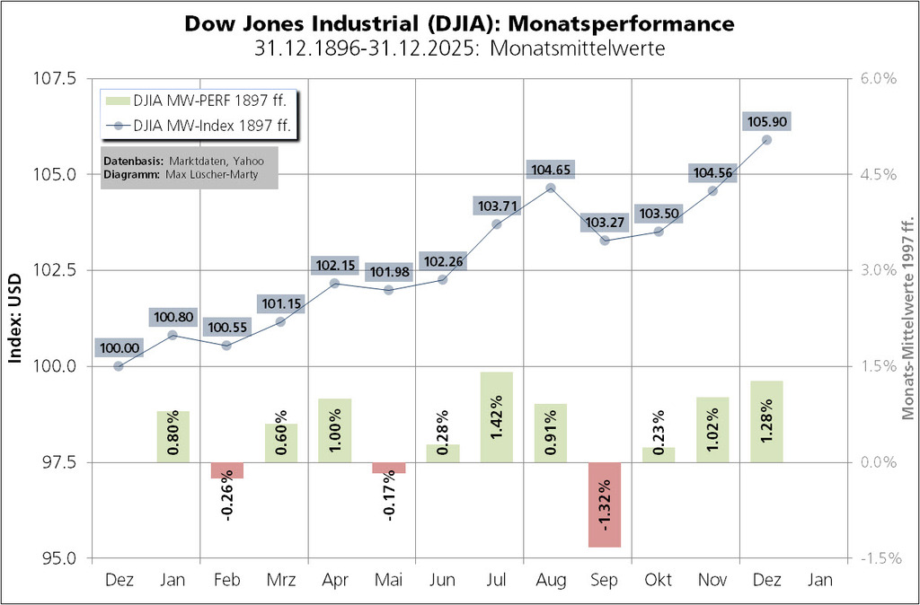 Eigentlich dürfte man erwarten, dass jeder Kalendermonat rund einen Zwölftel zur Langfristperformance des Dow Jones Industrial Average (DJIA) beiträgt. Dem ist aber nicht so: Von Ende 1896 bis Ende 2025 sind 81,29% der mittleren Jahresperformance von 5,90% in den Monaten April, Juli, November und Dezember erwirtschaftet worden. Der signifikant schlechteste Börsenmonat ist der September. Auch die Monate Februar und Mai performten in den letzten 129 Jahren im Schnitt negativ. Im statistischen Mittel am erfolgreichsten ist das 4. Quartal (mittlere Quartalsrendite: 2,55%).