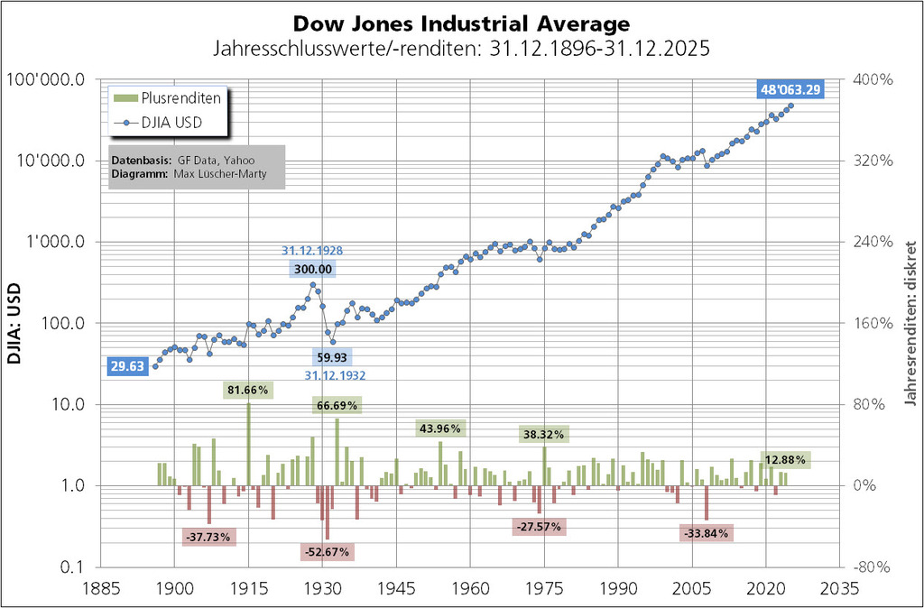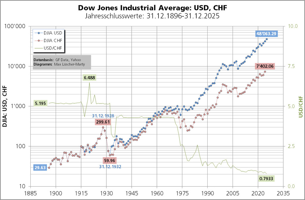 Mit Referenzwährung CHF rechnet sich für den Dow Jones Industrial (DJIA) vom 31.12.1896 bis zum 31.12.2025 eine Jahresrendite (Price Return) von 4,37%. Mit Referenzwährung USD (siehe weiter oben) sind es 5,90%. Grund für diese doch beachtliche Differenz ist der starke Schweizerfranken. Kostete ein USD 1896 CHF 5.195, galt ein USD Ende 2025 gerade noch CHF 0.7933.