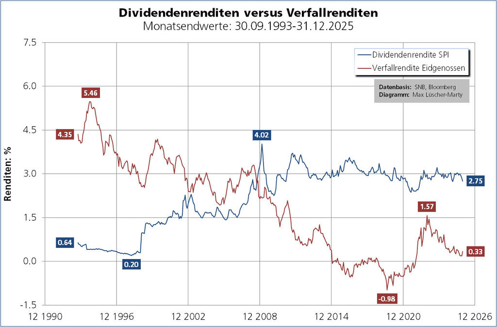 Traditionell reichen die Dividendenrenditen des Aktienmarkts Schweiz nicht an die Verfallrenditen von CHF-Bonds heran. Seit der Finanzmarktkrise ist das anders: Aktionäre von börsenkotierten CH-Unternehmen haben im Schnitt – neben deutlichen Kursgewinnen – Dividendenrenditen von plus/minus 3% erzielt. Auf den Punkt gebracht: CH-Aktien waren in jüngerer Zeit die besseren CHF-Bonds!!!