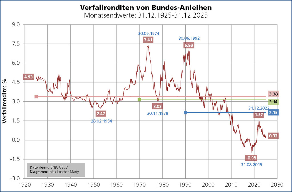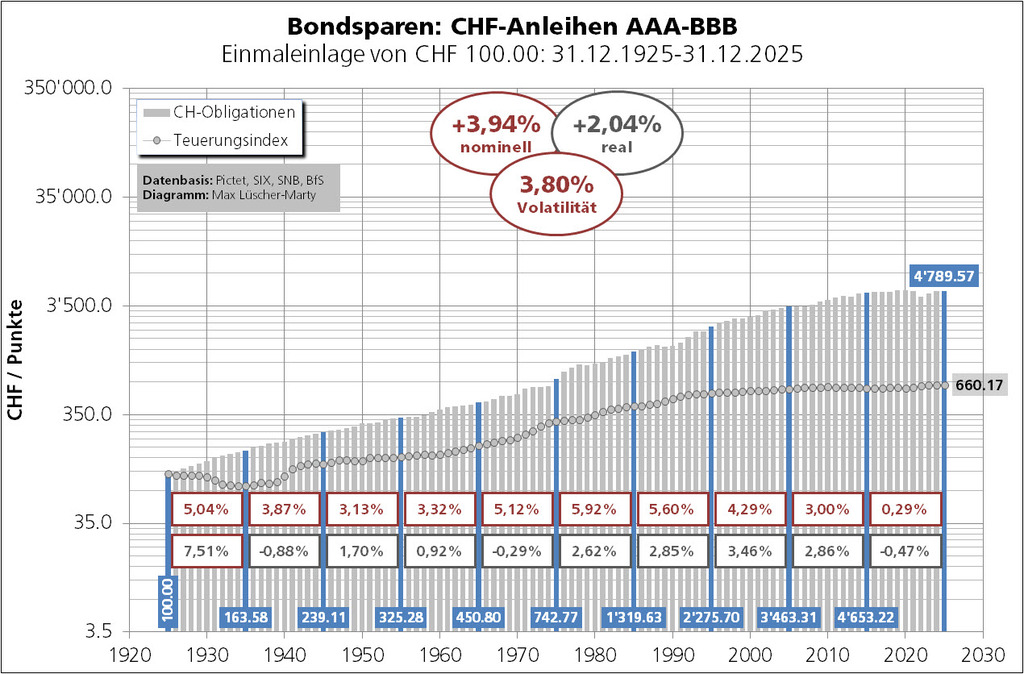 Ein CHF-Bondportfolio – aufgebaut am 31.12.1925 mit einer Einmaleinlage von CHF 100.00 – hätte sich gemäss Berechnungen der Banque Pictet & Cie SA bis zum 31.12.2025 zu einem Vermögen von CHF 4'789.57 entwickelt. Das entspricht einer mittleren Rendite von 3,94% pro Jahr (p.a.): ((4'789.57÷100.00)^(1/100))-1=0.0394. Bei einer mittleren Jahresteuerung für die letzten 100 Jahre von 1,91% rechnet sich – leicht vereinfacht – eine inflationsbereinigte Rendite (Realrendite) von 2,04% p.a.: 3.94–1.91=2.04(3).