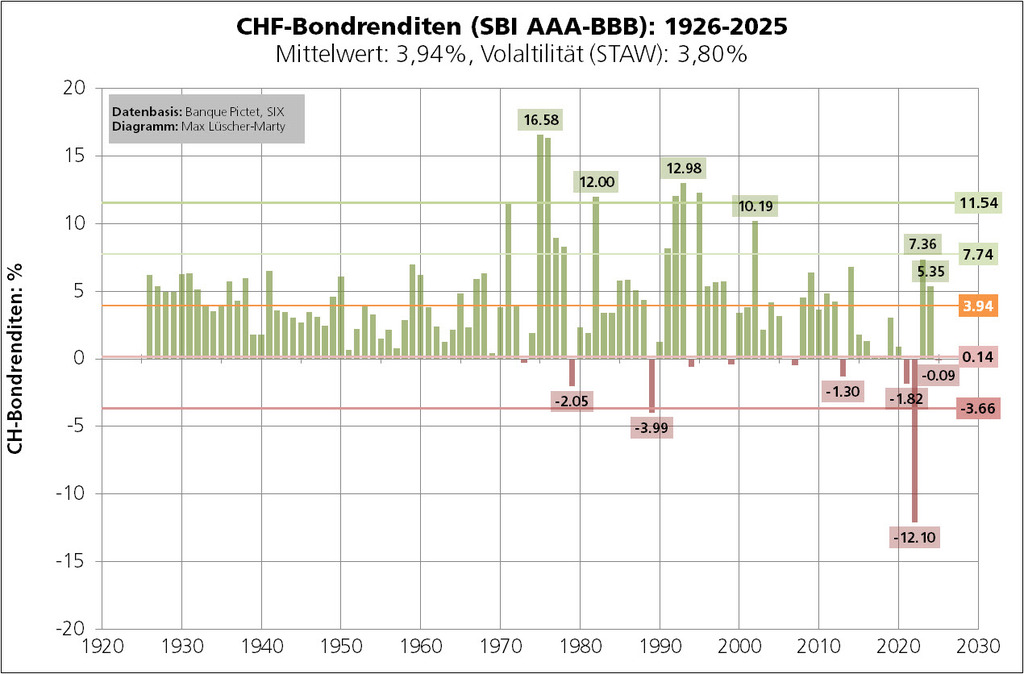 Für den Betrachtungszeitraum (31.12.1925 bis 31.12.2025) lässt sich eine jährliche Standardabweichung von 3,80% bestimmen. Bei einer nachhaltigen CH-Bondrendite von 3,94% bewegen sich künftige CHF-Bondrenditen mit einer Wahrscheinlichkeit von rund 68% innerhalb einer Bandbreite von +0,14% bis +7,74% (3.94 –/+3.80). Mit einer Wahrscheinlichkeit (WS) von rund 95% rechnet sich eine Bandbreite von –3,66% bis +11,54% (3.94 –/+2x3.80).