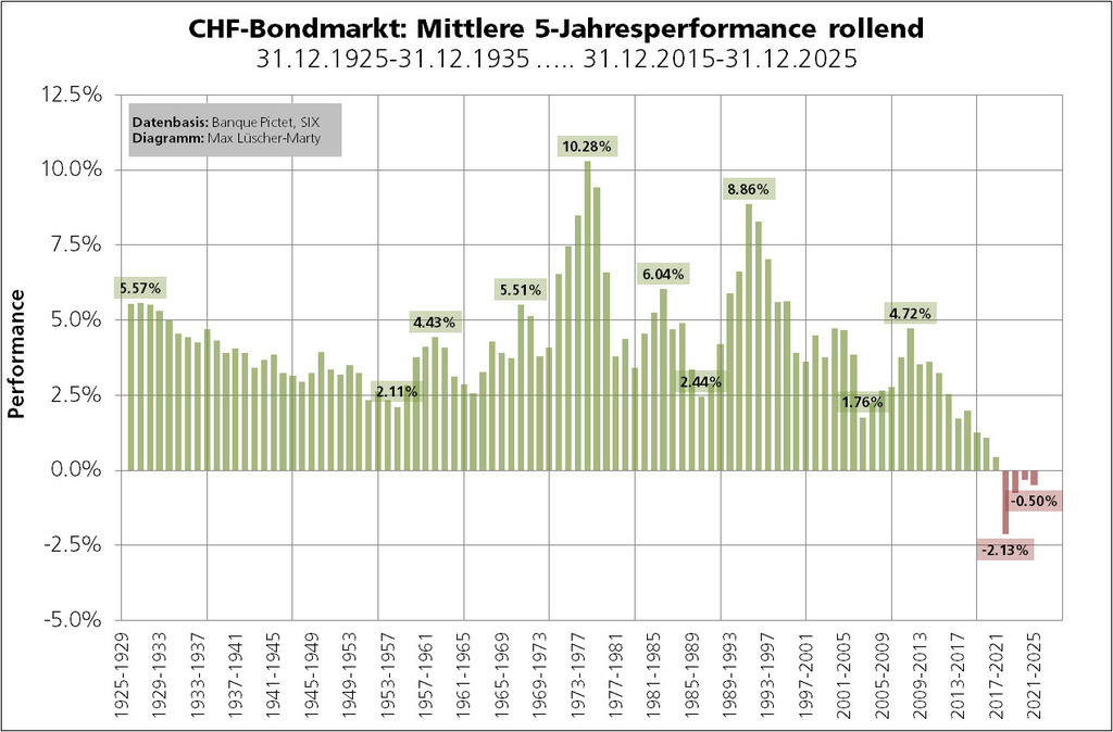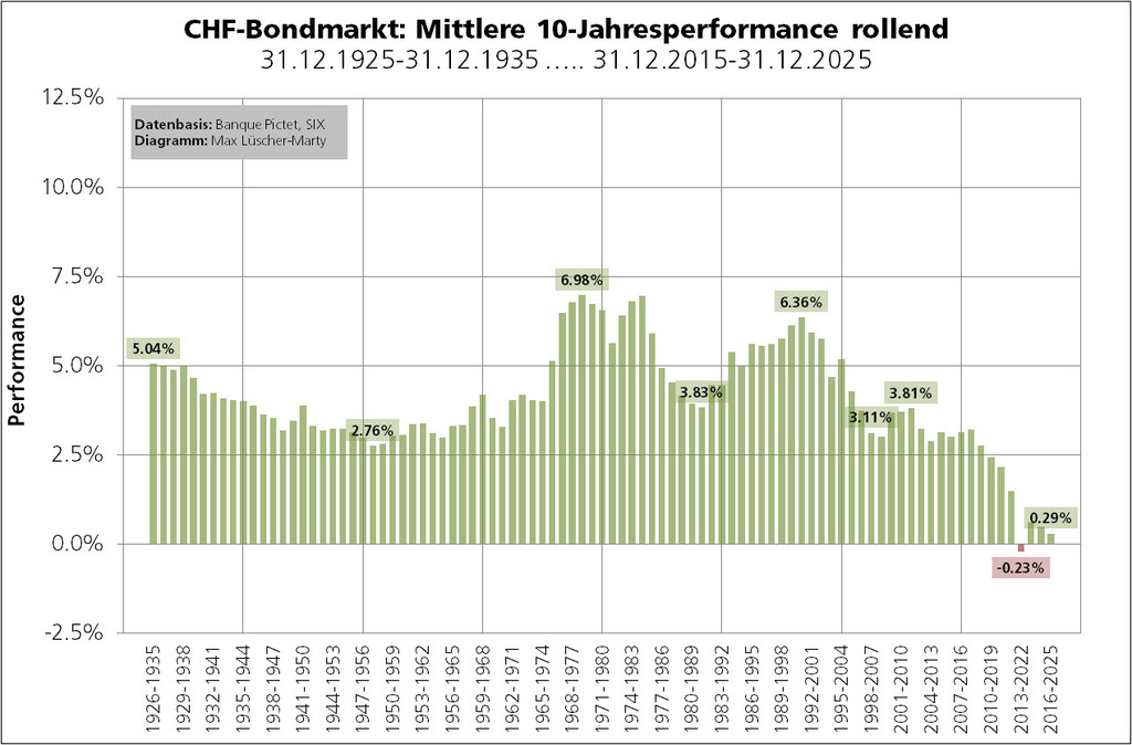 Für die jüngste Dekade (31.12.2015 bis 31.12.2025) rechnet sich eine Nominalrendite von 0,29% p.a.: ((4'789.57÷4'653.22)^(1/10))-1=0.0029. Bringt man von den 0,29% die mittlere Jahresteuerung der letzten zehn Jahre von 0,76% in Abzug, erhält man - leicht vereinfacht - die Realrendite von –0,47%.
