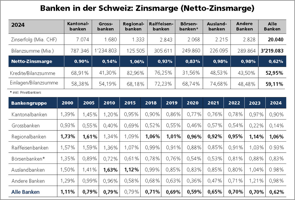 Alles in allem ist die Zinsmarge, d.h. der Zinserfolg in Prozent der Bilanzsumme im neuen Jahrtausend mehr und mehr erodiert: für alle Banken von 1,11% im Jahr 2000 auf 0,62% im Jahr 2024.