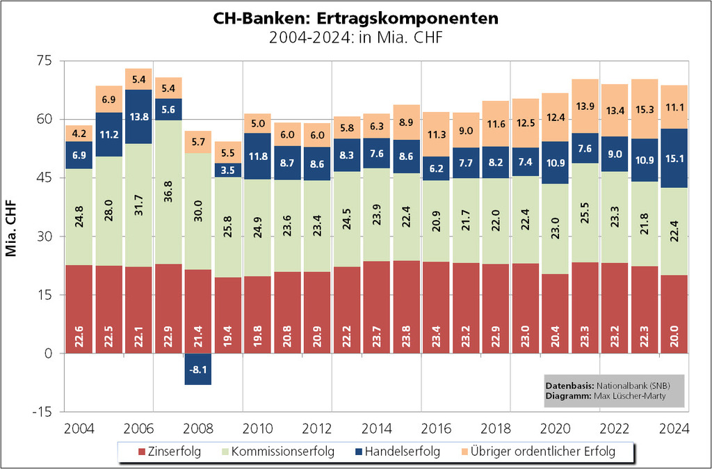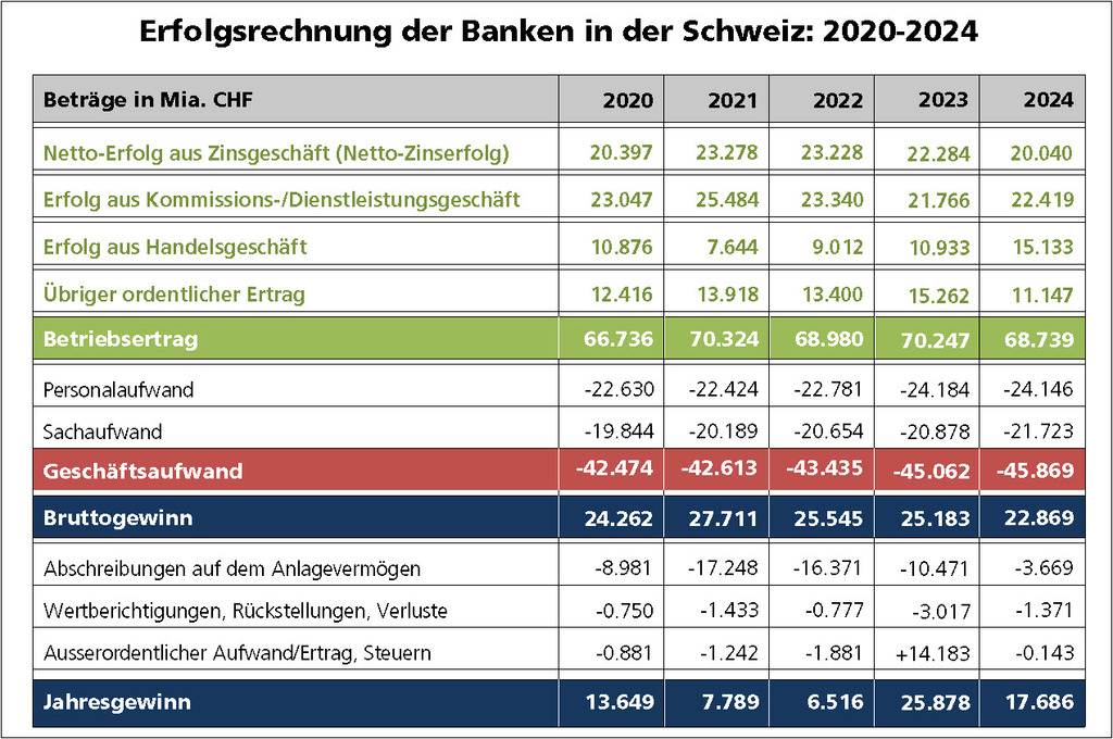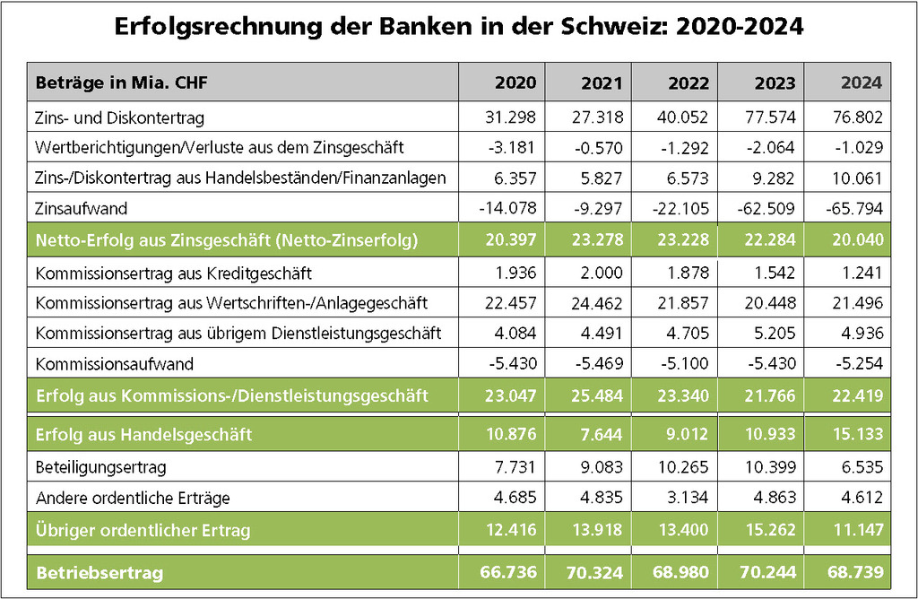 Das Schweizer Bankensystem ist auf dem Modell der Universalbank aufgebaut. Konkret: Alle Banken können alle Bankdienstleistungen anbieten. Das schlägt sich in der aggregierten Erfolgsrechnung der Banken in der Schweiz nieder, die vier Hauptertragsquellen offenlegt: das Zinsgeschäft, das Kommissions- und Dienstleistungsgeschäft, das Handelsgeschäft und den übrigen ordentlichen Ertrag. Für die letzten fünf Jahre präsentieren sich die vier Ertragssäulen der Banken in der Schweiz wie folgt: