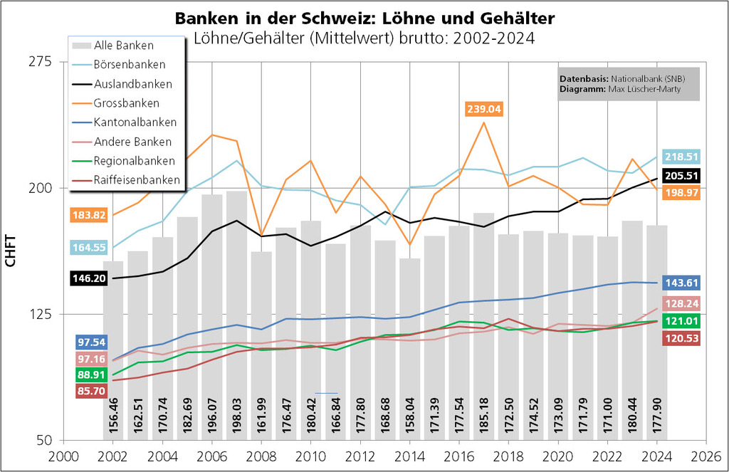 Die Boni in der «Beletage» der Banken geben immer wieder zu reden. Dabei geht zuweilen vergessen, dass die Bankbranche generell sehr gute Löhne zahlt. Mit mittleren Brutto-Jahreslöhnen im Bereich von CHF 200'000.00 stechen die Börsenbanken, die Auslandbanken und die Grossbank UBS heraus. Aber auch die durchschnittlichen Brutto-Jahreslöhne der Retailbanken sind nicht wirklich von «schlechten Eltern». Die aussagekräftigeren Median-Löhne lassen sich anhand der Bankenstatistik leider nicht ermitteln.