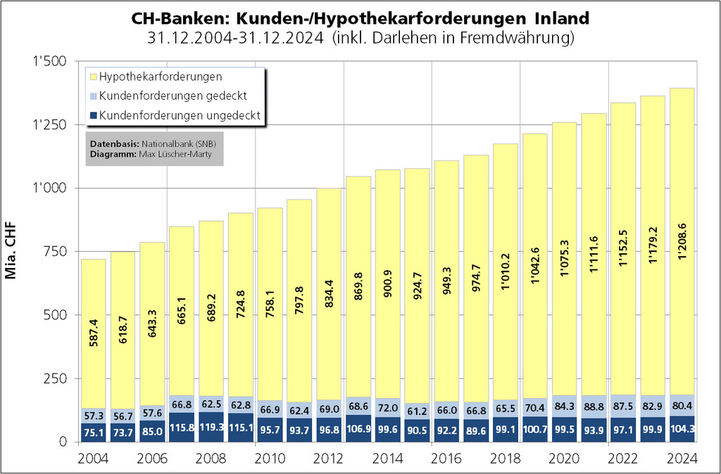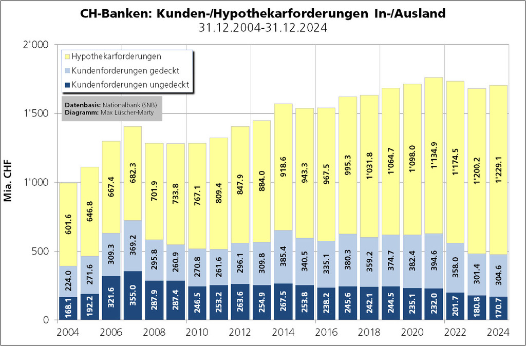 Noch ausgeprägter ist das Verhältnis von gedeckten zu ungedeckten Krediten im Inlandgeschäft. Ende 2023 waren 92,74% der Inlandkredite gedeckt, 87,54% durch Grundpfand und 5,12% durch andere Sicherheiten. Bloss 7,34% aller Inlandkredite waren unbesichert. Vor 27 Jahren, Ende 1996, war der Anteil der Blankokredite mehr als doppelt so hoch (15,82%).