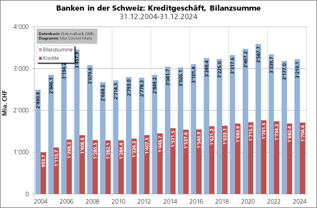 Bis zum Ausbruch der Finanzmarktkrise hat sich der Bilanzsummen-Anteil des klassischen Kreditgeschäfts der Banken in der Schweiz nach und nach verringert. 1991 machten die Kreditausleihungen 64,72% der Bilanzsumme aus; 2005 waren es noch 39,02%. Verantwortlich dafür war im Wesentlichen die Geschäftspolitik der Schweizer Grossbanken. Seit Ende 2012 macht der Anteil der Kredite an Nichtbanken (Hypothekar- und andere Kundenforderungen) wieder rund 50% der Bilanzsumme aus (Ende 2023 = 52,96%).
