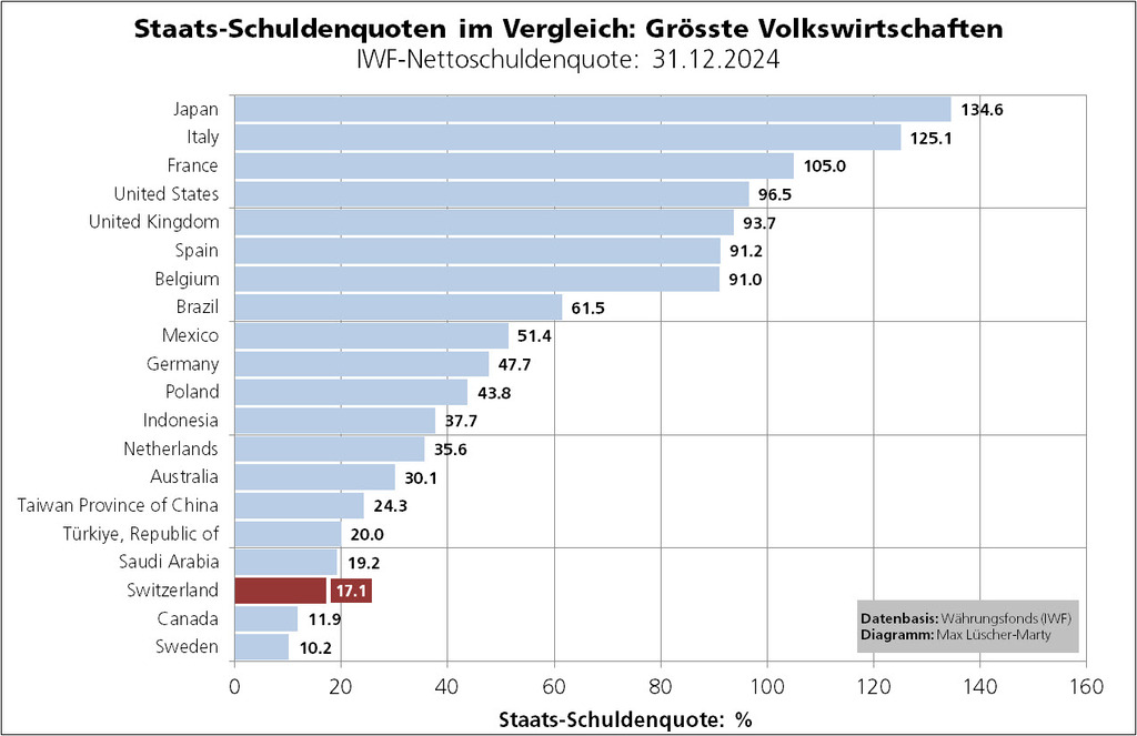 Im internationalen Vergleich kommt die IWF-Bruttoschuldenquote der Schweiz von 37,58% recht moderat daher. Besorgniserregend sind vor allem die Schuldenquoten von Japan (236,7%), Italien (135,3%) und den USA (113,1%).