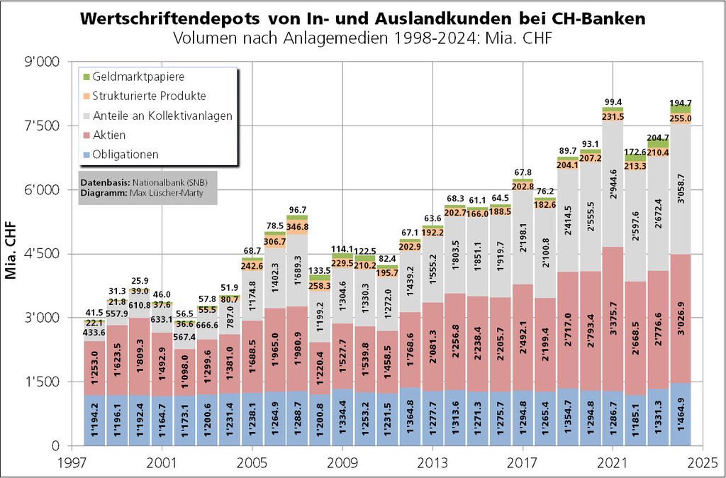 Ende 2024 macht es den Anschein, als sei der 2022er-Crash verdaut. Das Depotvolumen (CHF 8'000.192 Mia.) ist wieder etwas höher als jenes per 31.12.2021 (CHF 7'937.775 Mia.). Bei näherem Hinsehen wird klar, dass dies für die deponierten Aktien nicht zutrifft. Der Aktienbestand per 31.12.2024 (3'026.933) notiert nach wie vor deutlich tiefer als jener per 31.12.2021 (3'375.697). Vom Taucher im Jahr 2022 (–707.185) ist nicht einmal die Hälfte (+348.746) wettgemacht. Deutlich zugelegt haben hingegen die Bestände in Obligationen (31.12.2021: 1'286.660, 31.12.2024: 1'464.88), in Kollektivanlagen (31.12.2021: 2'944.588, 31.12.2024: 3'058.671) und in Geldmarktpapieren (31.12.2021: 99.359, 31.12.2024: 194.654).
