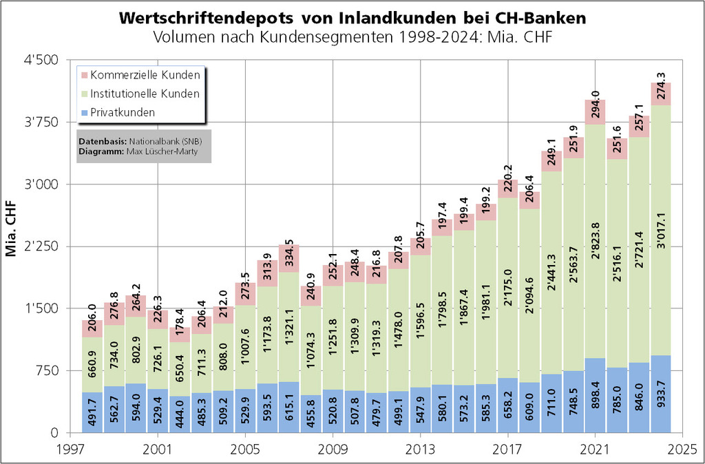 Die Wertschriftenbestände inländischer Kunden per 31.12.2024 werden mit CHF 4'225.090 Mia. ausgewiesen. Institutionelle und kommerzielle Kunden halten Wertschriften im Gegenwert von CHF 3'291.344 Mia. (77,90%). CHF 933.746 Mia. (22,10%) sind im Eigentum von Privatkunden. Ende der 1990er-Jahre machten die Depotwerte der inländischen Privatkundschaft noch mehr als 35% aus.