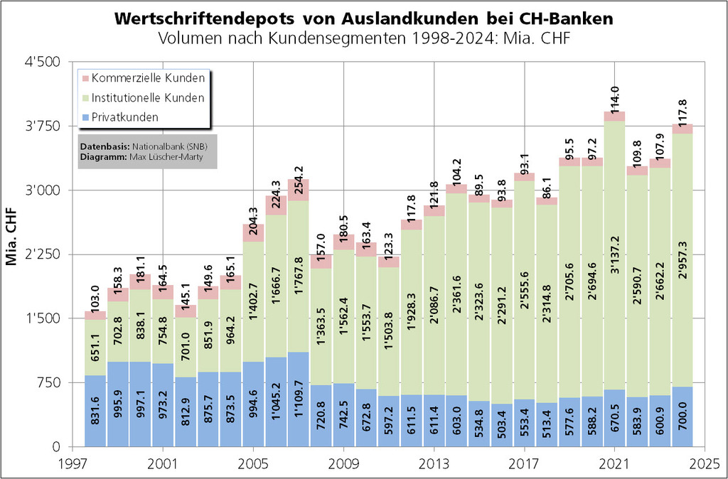Die Wertschriftenbestände ausländischer Kunden per 31.12.2024 werden mit CHF 3'775.102 Mia. ausgewiesen. CHF 3'075.072 Mia. (81,46%) gehen aufs Konto von institutionellen und kommerziellen Kunden. CHF 700.030 Mia. (18,54%) sind im Eigentum von Privatkunden. Ende der 1990er-Jahre machten die Depotwerte der ausländischen Privatkundschaft noch mehr als 50% aus!