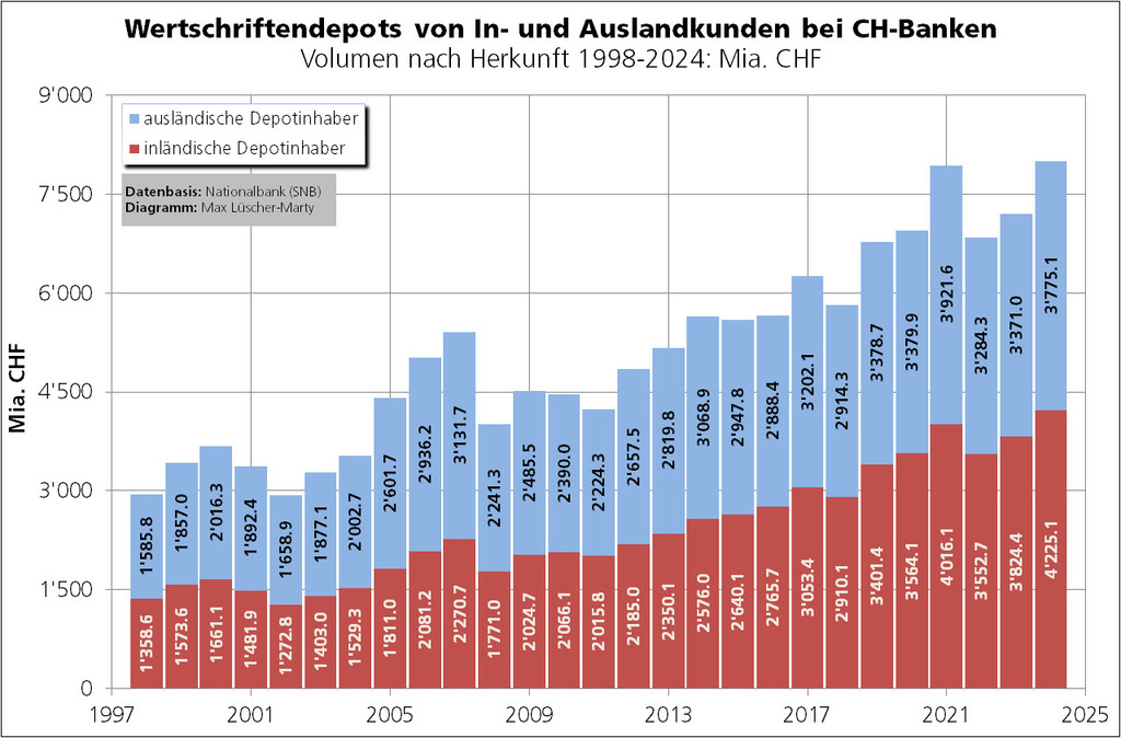 Die Wertschriftenbestände in den Kundendepots der Banken in der Schweiz beliefen sich per Ende 2024 auf CHF 8'000.192 Mia. Sie überstiegen damit die Bilanzsumme (31.12.2024: 3'219.083) um den Faktor 2.49! Vor 26 Jahren, Ende 1998, lag der Faktor noch bei 1.43 (Wertschriftenbestände: 2'944.448, Bilanzsumme: 2'057.924).